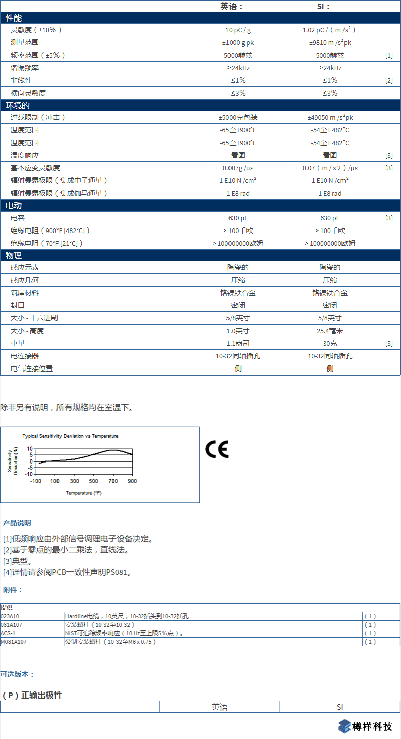 高溫,陶瓷壓縮,電荷輸出加速,10 pC / g,5kHz,10-32側連接。(-65°F至+ 900°F),配有10英尺硬線電纜靈敏度:(±10%)10 pC / g(1.02 pC /(m /s2))測量范圍:±1000 g pk(±9810 m /s2pk)頻率范圍:(±5%)5000 Hz重量:1.1盎司(30克)