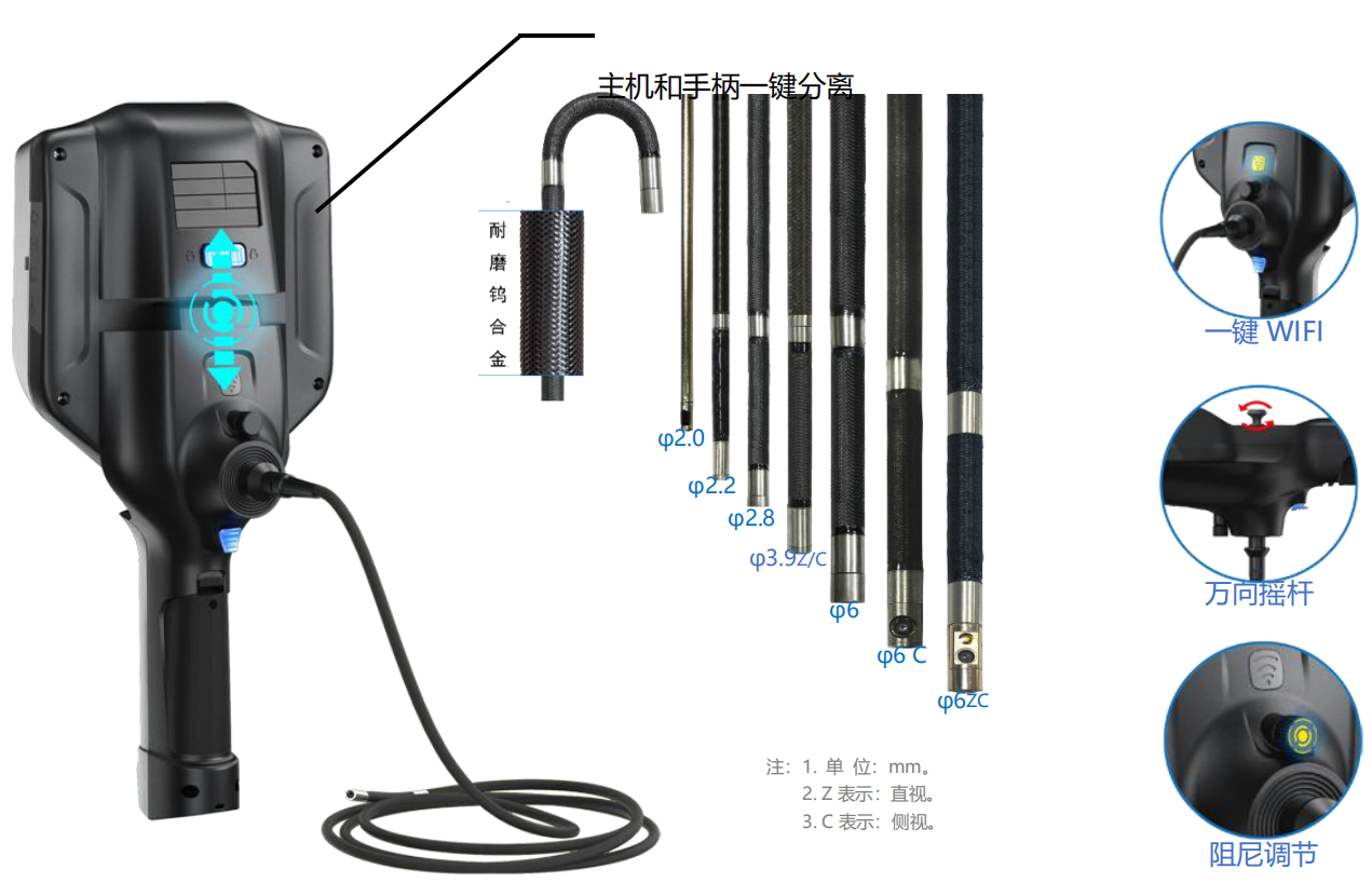 ***清內(nèi)窺鏡采用模塊化設計,主機與手柄可一鍵分離。并且兼容 2.0mm/2.2mm/2.8mm/3.9mm/6mm 的管線系統(tǒng),同時也兼容 3.9mm 側(cè)視管線、6mm 側(cè)視管線、6mm 直側(cè)視管線。產(chǎn)品幾乎滿足了各種檢測現(xiàn)場的需求。