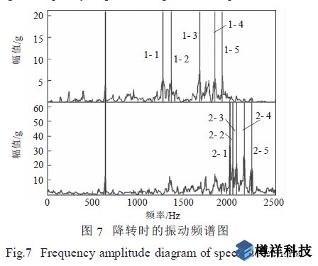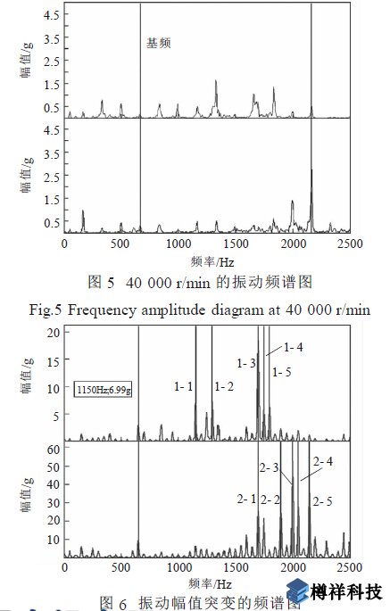 圖6 為從30 000 r/min 推到40 000 r/min 的上升過程中達(dá)到39 000 r/min 時(shí)振動(dòng)幅值頻譜發(fā)生突變的頻譜圖。從圖中可以看出, 在1 100 Hz~2 100Hz 之間出現(xiàn)了峰值群, ******振動(dòng)幅值達(dá)57.44g, 基頻振動(dòng)幅值也超過了10g。這表明此時(shí)渦輪增壓器的機(jī)械運(yùn)行狀態(tài)發(fā)生突變, 已經(jīng)出現(xiàn)了故障。圖7 為報(bào)警后試驗(yàn)件迅速降轉(zhuǎn)時(shí)的振動(dòng)頻譜圖, 圖中中***頻的大幅振動(dòng)峰群仍然存在, 基頻嚴(yán)重超限, 已經(jīng)達(dá)到了14.45g, 渦輪增壓器已經(jīng)不能正常運(yùn)行。