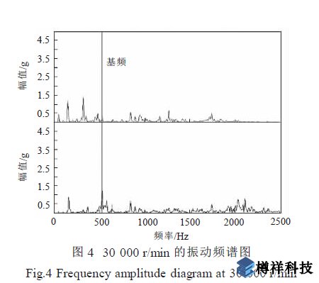 圖4 為穩(wěn)定在30 000 r/min 的振動(dòng)頻譜圖, 圖5為以前試驗(yàn)中穩(wěn)定在40 000 r/min 的振動(dòng)頻譜圖。在這兩幅圖中, 都有低于基頻的頻率成分出現(xiàn), 似乎出現(xiàn)了次諧波振動(dòng)。經(jīng)分析發(fā)現(xiàn), 圖中低于基頻的幅值都是由工頻干擾信號(hào)引起的, 不是異常振動(dòng)信號(hào)。圖4、圖5 中, 從0 Hz~2 500 Hz 的頻帶內(nèi)振動(dòng)幅值都不超過4g, 沒有中***頻峰值群出現(xiàn), 基頻振動(dòng)幅小于2g。這說明在這兩個(gè)狀態(tài)下, 渦輪增壓器轉(zhuǎn)子系統(tǒng)運(yùn)行正常。