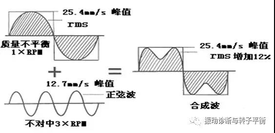 在這個例子中,有兩個頻率成分,一個是速度峰值為25.4mm/s 的 1 倍頻,另一個頻率成分是速度峰值為 12.7mm/s的倍頻。這兩個頻率成分復(fù)合產(chǎn)生了所示的合成波形。注意合成波形的速度峰值是25.4mm/s,與1倍頻分量的幅值相等。通過比較發(fā)現(xiàn),合成波形的 RMS 值,或者說是矩形里的陰影區(qū)域增 加12%。換句話說,如果采用峰值響應(yīng)進(jìn)行測量,由于頻率成分的復(fù)合,可能出現(xiàn)合成波形的峰值小于振動主頻的峰值,但是使用 RMS 測量,合成波形的幅值與頻率成分的相對相位關(guān)系無關(guān)。