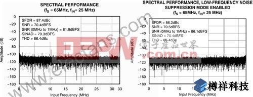 圖 2 請(qǐng)注意,一旦該模式被激活 1/f 噪聲(基帶附近)便被轉(zhuǎn)換為奈奎斯特,并且兩種情況下均可看到 0-1MHz 的 SNR根據(jù)奈奎斯特 (32.5MHz) 測得 65MSPS 下 ADS5282 的 SNR 為 70.4dBFS。