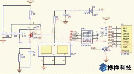 具體實(shí)現(xiàn)為:?jiǎn)纹瑱C(jī)PB0口為發(fā)碼電路的數(shù)據(jù)輸出口和控制口,當(dāng)需要發(fā)碼的時(shí)候該口設(shè)置為輸出口,然后以脈沖的形式,按照相關(guān)的通信協(xié)議,輸出當(dāng)前所要發(fā)出的正確數(shù)據(jù)。反之,PB0口可復(fù)用為其他功能。PB0口的脈沖數(shù)據(jù)經(jīng)發(fā)碼電路調(diào)制并發(fā)射出433MHz的無(wú)線電波。