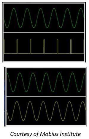 因此,有兩個(gè)信號被比較:振動信號和由反射帶通過觸發(fā)的轉(zhuǎn)速計(jì)脈沖,或來自關(guān)鍵相位器的脈沖。轉(zhuǎn)速計(jì)脈沖產(chǎn)生方波,而振動信號發(fā)出正弦波。