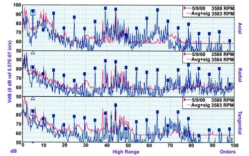 注意,諧波系列在***范圍的所有三個(gè)軸上具有強(qiáng)振幅,而在低范圍數(shù)據(jù)中僅在軸向方向上突出。***頻噪聲底板與一個(gè)西格瑪面罩大致相同或更低,告訴我們軸承磨損不是接近故障點(diǎn); 然而,強(qiáng)諧波系列意味著存在缺陷。