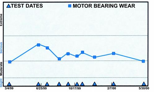 嚴(yán)重程度評分的趨勢是機(jī)器健康狀況的良好指標(biāo)。對于每個(gè)診斷規(guī)則模板,嚴(yán)重性分?jǐn)?shù)將映射到嚴(yán)重性等級,包括輕微,中度,嚴(yán)重和極端。用于確定嚴(yán)重性的算法是基于由振動(dòng)專***手動(dòng)分析的大量測試結(jié)果針對每個(gè)診斷憑經(jīng)驗(yàn)導(dǎo)出的。如果軸承磨損的指示(軸承音,諧波,邊帶和本底噪聲)隨著時(shí)間的推移而增加,專***系統(tǒng)將認(rèn)識到這一事實(shí),并且分配給軸承磨損診斷的嚴(yán)重性將增加。在趨勢圖(圖7)中,電機(jī)軸承磨損故障嚴(yán)重程度已經(jīng)趨于平穩(wěn)。