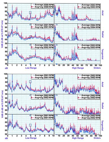 圖6顯示了3月25日在冷卻器4上收集的電機(jī)自由端數(shù)據(jù)。平均值+ Avg + sigma掩模(紅色)疊加用于比較。x軸以階數(shù)為單位進(jìn)行縮放,其中階數(shù)“1”表示電動(dòng)機(jī)的轉(zhuǎn)速。請注意軸向低范圍數(shù)據(jù)中突出的非同步峰值為4.9xM和7.1xM。這些峰值對應(yīng)于電機(jī)軸承的滾珠軸承通過頻率。在***范圍光譜中,諧波標(biāo)記被放置在諧波系列的每個(gè)峰上,間距為4.9xM。