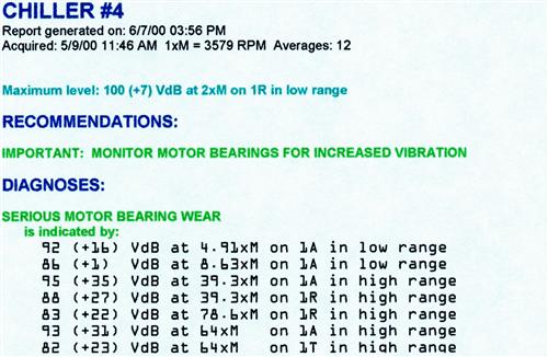 用于識別故障及其嚴(yán)重性的專***系統(tǒng)邏輯是作為經(jīng)驗(yàn)過程的一部分創(chuàng)建的,其中將大量機(jī)器上的自動(dòng)診斷與振動(dòng)專***在那些相同機(jī)器上進(jìn)行的診斷進(jìn)行比較。因此,專***邏輯規(guī)則反映了振動(dòng)專***如何分析數(shù)據(jù)。因此,專***系統(tǒng)并不比創(chuàng)建它的振動(dòng)分析師更好。由于前一段中概述的所有步驟都是常規(guī)和重復(fù)的,因此現(xiàn)代計(jì)算機(jī)可以在幾臺秒內(nèi)快速執(zhí)行所有四個(gè)分析步驟。然后專***系統(tǒng)為冷卻器電機(jī)軸承磨損生成基于文本的報(bào)告,如圖5所示。