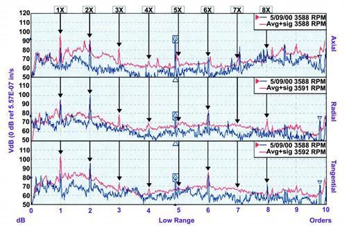 然后,計(jì)算平均加一西格瑪光譜掩模。據(jù)統(tǒng)計(jì),大約85%的振動(dòng)幅度應(yīng)低于平均值加上一個(gè)西格瑪面罩。與供應(yīng)商定義的通過/未通過標(biāo)準(zhǔn)或絕對標(biāo)準(zhǔn)(如IRD圖表)不同,相對標(biāo)準(zhǔn)允許機(jī)器本身定義可接受的內(nèi)容。圖3是在該案例歷史中使用的相對接受標(biāo)準(zhǔn)的一個(gè)軸的示例。圖4顯示了低和***范圍數(shù)據(jù)的所有三個(gè)軸的平均和平均加西格瑪水平。如果800線譜中的一個(gè)或多個(gè)峰超過平均加西格瑪振幅標(biāo)準(zhǔn),則僅這一事實(shí)并不表示存在嚴(yán)重問題(參見診斷策略部分)。