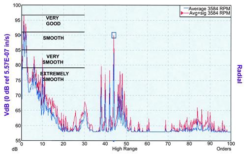 圖3.通過對來自12個(gè)相同冷卻器的光譜進(jìn)行平均,專門針對1,250噸冷水機(jī)生成相對驗(yàn)收標(biāo)準(zhǔn)。顯示的平均值(藍(lán)色底部光譜)和平均值加上一個(gè)標(biāo)準(zhǔn)偏差(紅??色頂部光譜)標(biāo)準(zhǔn)是徑向軸。IRD嚴(yán)重程度圖標(biāo)準(zhǔn)被疊加用于比較。