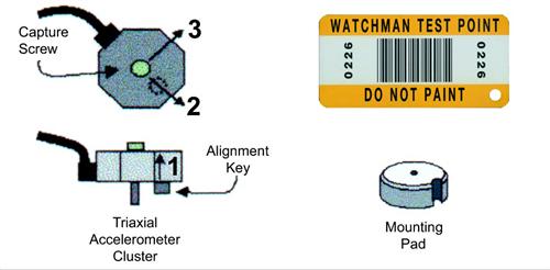 圖2.三軸加速度計(jì)組(左圖)的示意圖,其安裝在青銅盤安裝墊(右下)上。該集群包含三個(gè)加速度計(jì),每個(gè)加速度計(jì)與其他加速度計(jì)相互垂直。使用條形碼激活振動(dòng)數(shù)據(jù)采集,條形碼自動(dòng)設(shè)置數(shù)據(jù)采集器,收集并存儲(chǔ)數(shù)據(jù)。