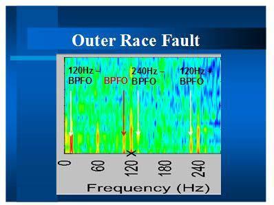 由此得出的計算結(jié)果表明,外圈缺陷應(yīng)出現(xiàn)在107 hz,邊帶與振動頻譜中的電機(jī)速度相關(guān),并且是扭矩譜中基頻的兩倍(圖2和圖3)。具有邊帶的外圈缺陷在動態(tài)采集的數(shù)據(jù)中比振動光譜更容易確定。