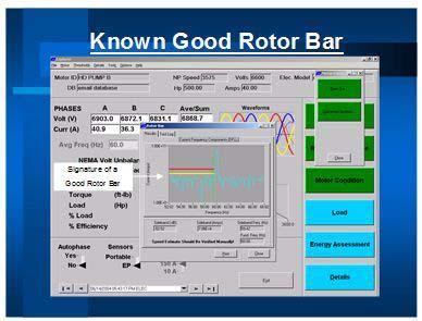 在另一項實驗室控制的研究中,使用動態(tài)測試儀徹底測試了在小型測力計上滿負(fù)荷運(yùn)行的1馬力電動機(jī)。然后保存并分析結(jié)果。移除轉(zhuǎn)子,并通過一個轉(zhuǎn)子條鉆出一個5/8英寸的孔,將其完全切斷。電動機(jī)在相同條件下組裝和重新測試。再次,保存結(jié)果,然后與原始數(shù)據(jù)進(jìn)行比較(圖4和5)。